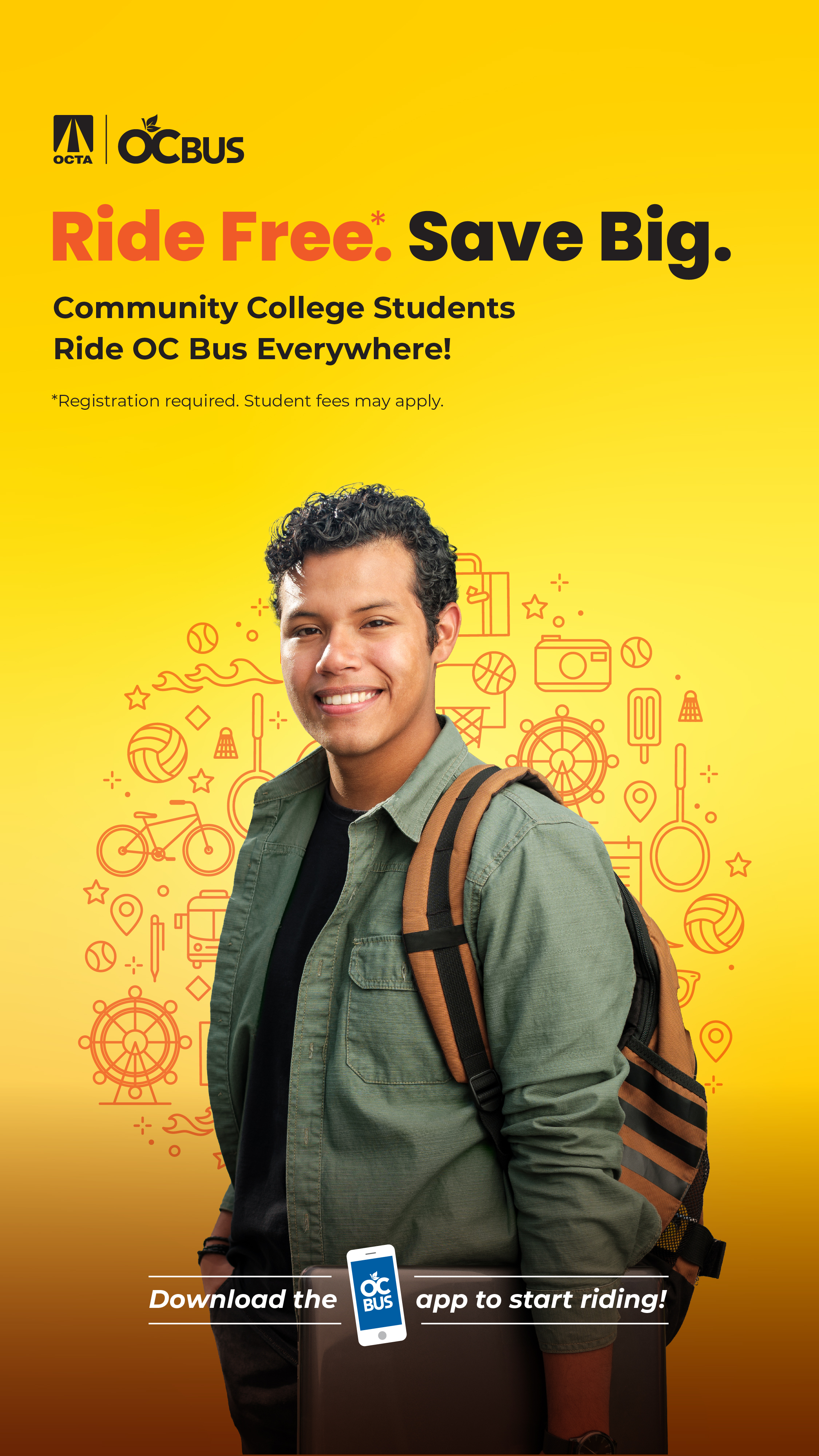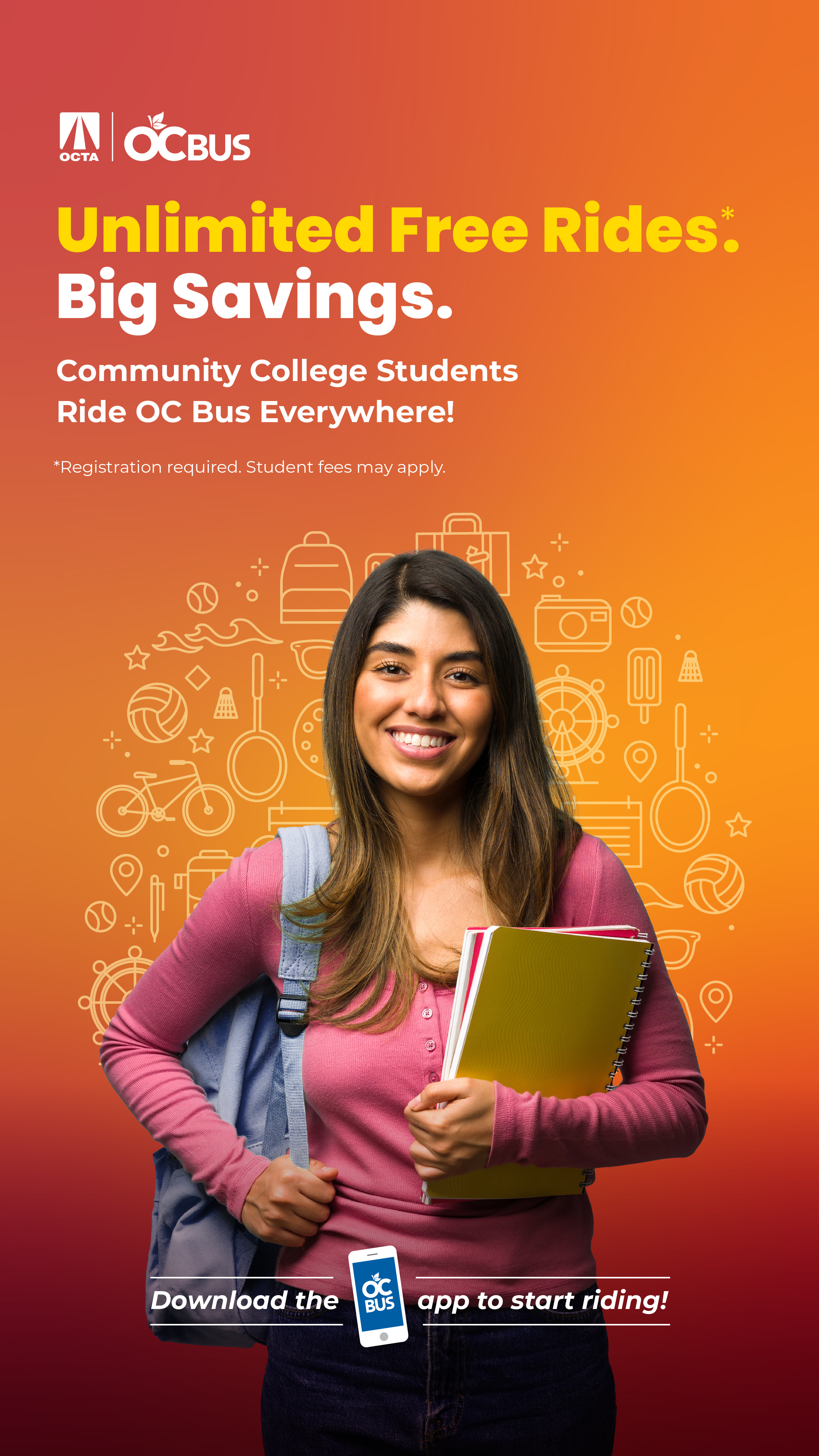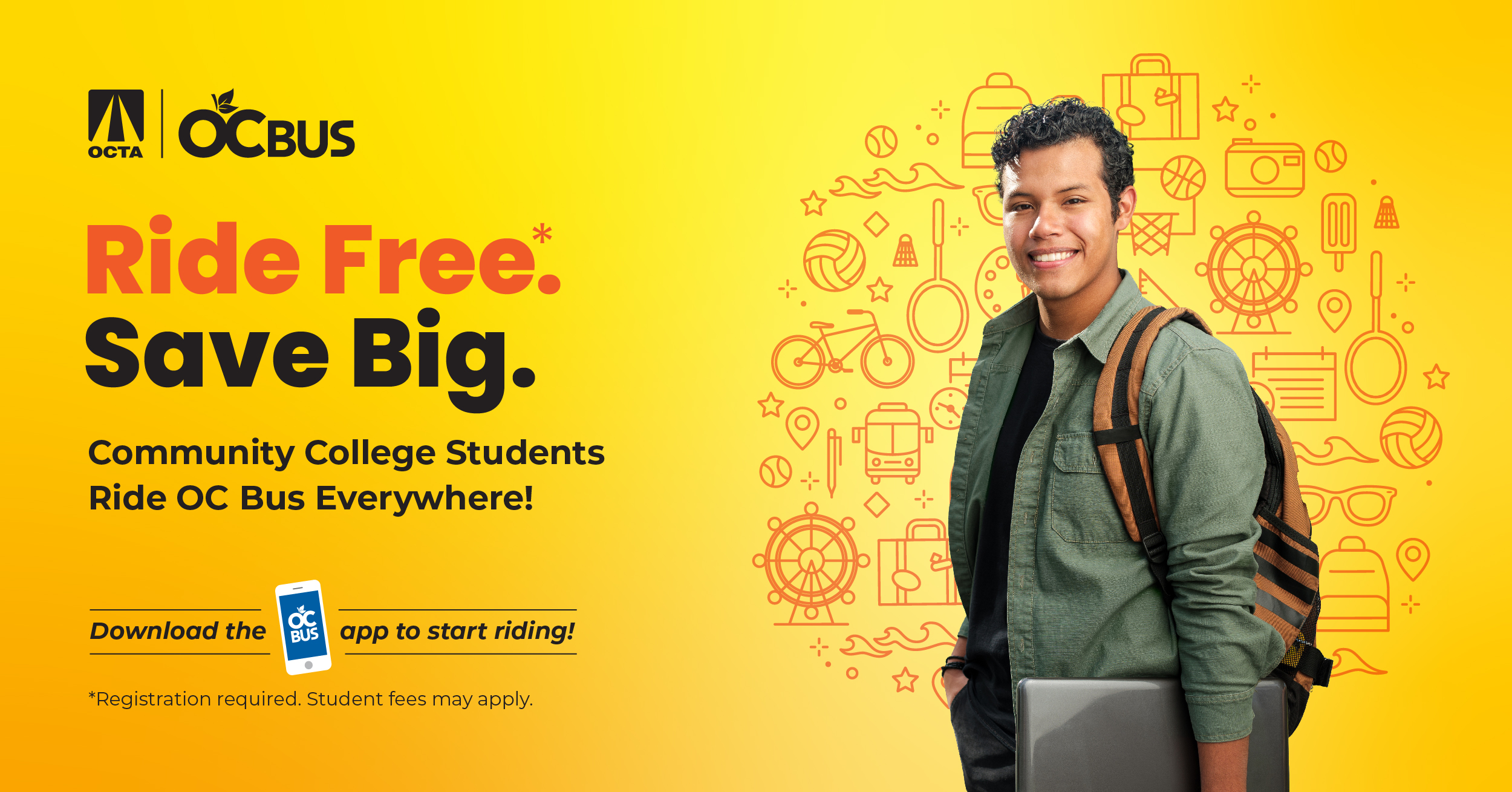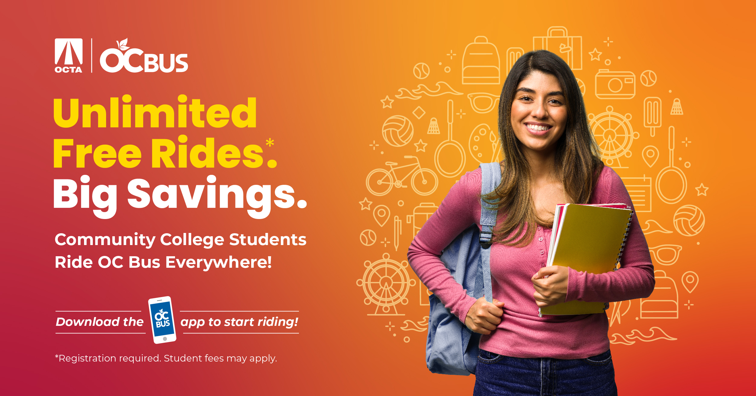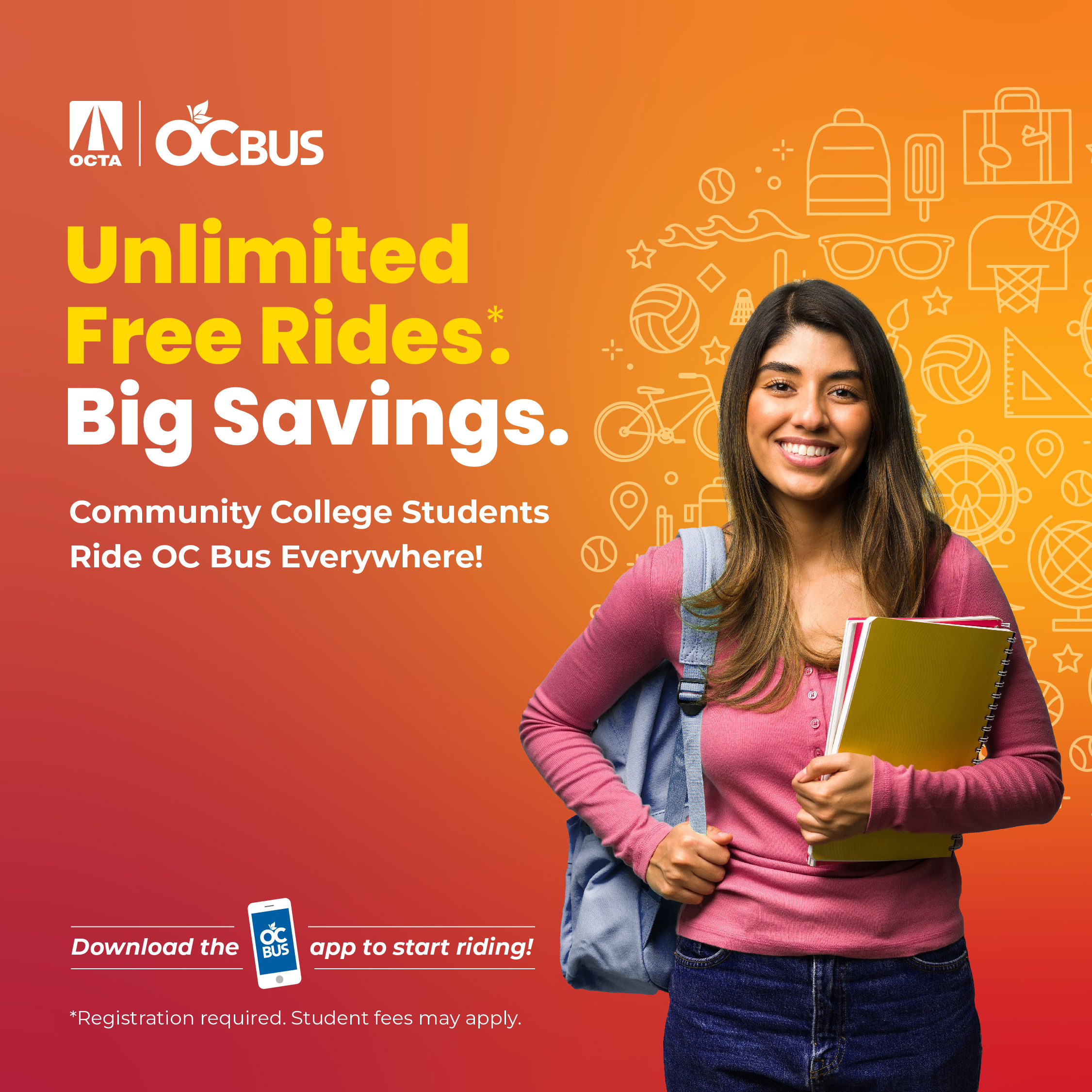 The OCTA Community College Pass Program provides all 9 community college students with free travel on the OC Bus service to school, work or fun on safe, clean and reliable buses.