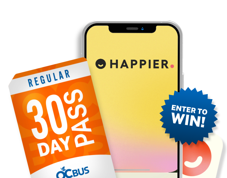 Tham gia để có cơ hội nhận vé xe buýt OC Bus 30 ngày + một năm sử dụng ứng dụng Happier miễn phí để nâng cao trải nghiệm di chuyển và cải thiện sức khỏe tinh thần! Ngoài ra, hãy chia sẻ cách mà OC Bus đã giúp quý vị đến các cuộc hẹn chăm sóc sức khỏe và nâng cấp cuộc sống của quý vị. Những hành khách chia sẻ câu chuyện của mình sẽ có cơ hội được giới thiệu trên mạng xã hội.