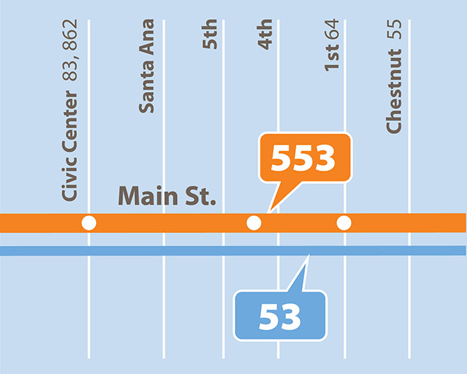 Route 553 serves 19 stops along Main Street and beyond, providing faster service between Anaheim and Costa Mesa. New zero-emission buses are powered by electric batteries.
