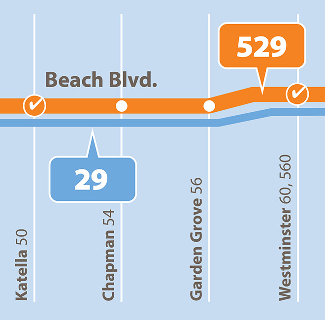 Route 529 serves 13 stops along Beach Blvd., providing faster service between Fullerton and Huntington Beach.