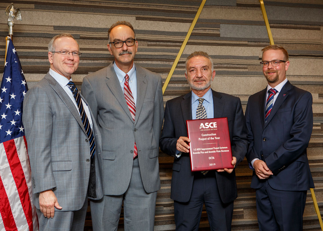 Photo attached: Orange County Transportation Authority officials receive the American Society of Civil Engineers’ 2019 Project of the Year award for the Interstate 5 HOV Improvement Project on Oct. 5, 2019. From left to right: Charlie Guess, Jacobs Construction Management; Behrooz Pirzadeh, Caltrans Senior Resident Engineer; Hamid Torkamanha, OCTA Senior Project Manager; Daniel Cronquist, ASCE Los Angeles Section President. Photo courtesy of OCTA.