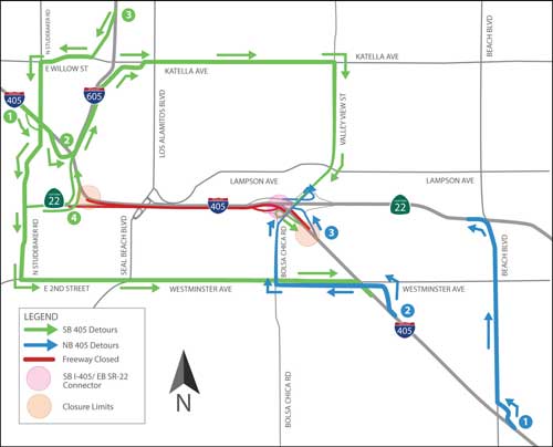 The southbound I-405 connector to the eastbound SR-22 freeway is being reconstructed in order to make room for the new SR-22 / I-405 carpool connector. Once construction on the new connector is complete, the old connector must be demolished. Since the southbound I-405 / eastbound SR-22 connector crosses over the I-405 freeway (near Valley View Street), in order to demolish the old structure, portions of the eastbound SR-22, northbound I-405 and southbound I-405 freeways will be closed for approximately 20 hours, over a weekend in mid-August 2013.