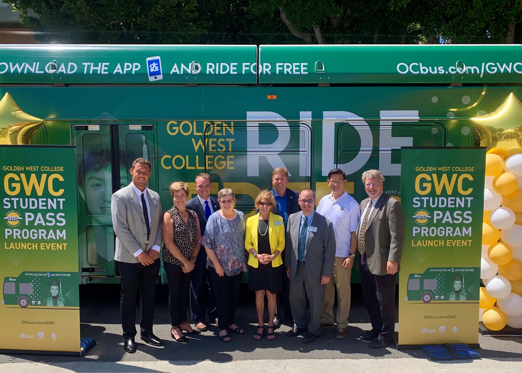 Photo caption: Transportation and education leaders from the Orange County Transportation Authority and Golden West College gathered Wednesday, Aug. 28 on the campus of Golden West College to mark the launch of a new student bus pass program that allows college students to ride the OC Bus system for free during a three-year pilot program.