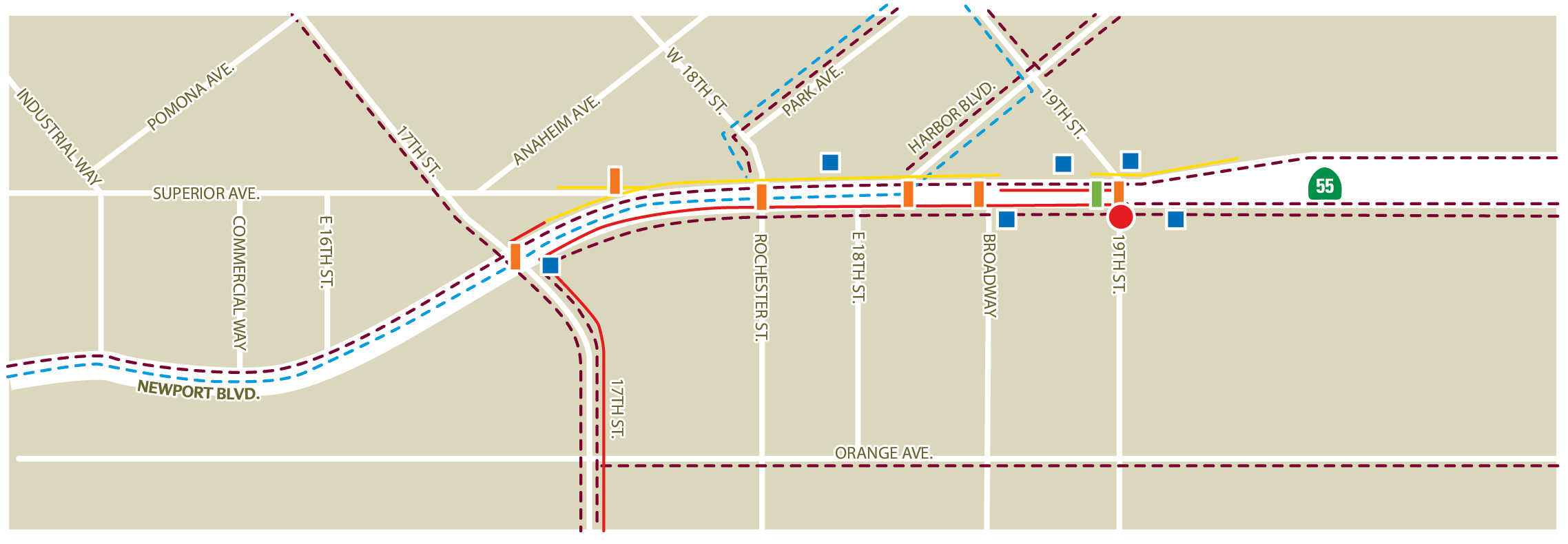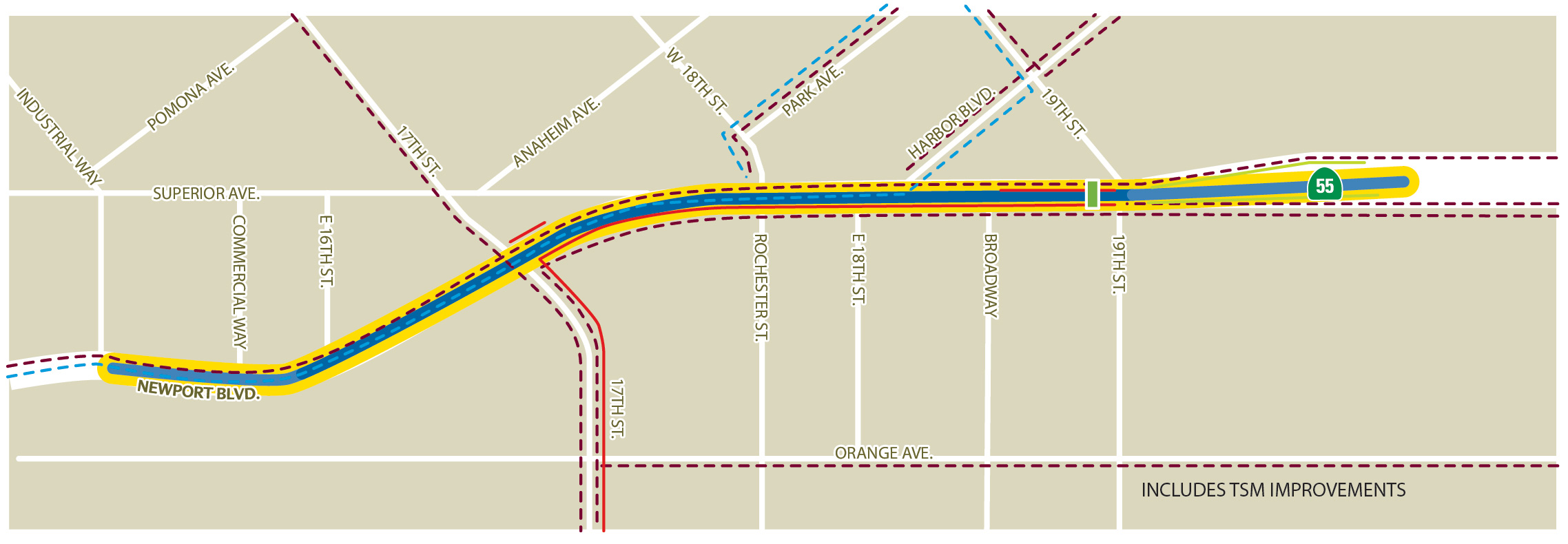 Currently, no funding has been identified for the next phase of the study or for the ultimate project improvements selected. However, the completion of the SR-55 Newport Boulevard Improvements Study allows the City of Costa Mesa to move potential improvements through the planning process.
