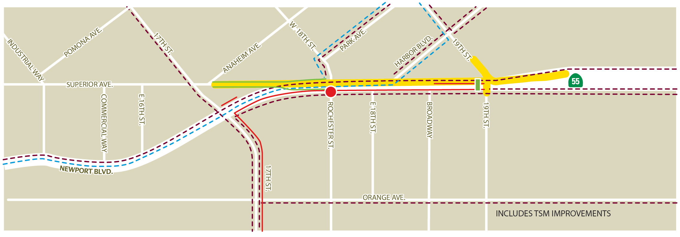 This effort was a continuation of the 2008 SR-55 Access Study, which identified four alternatives for further study (No Build, TSM, Elevated Turn Lanes, and Cut and Cover). The effort analyzed these alternatives in greater depth and identified initial scope, schedule, and cost considerations for the next phase of the project development process — completion of an environmental document.