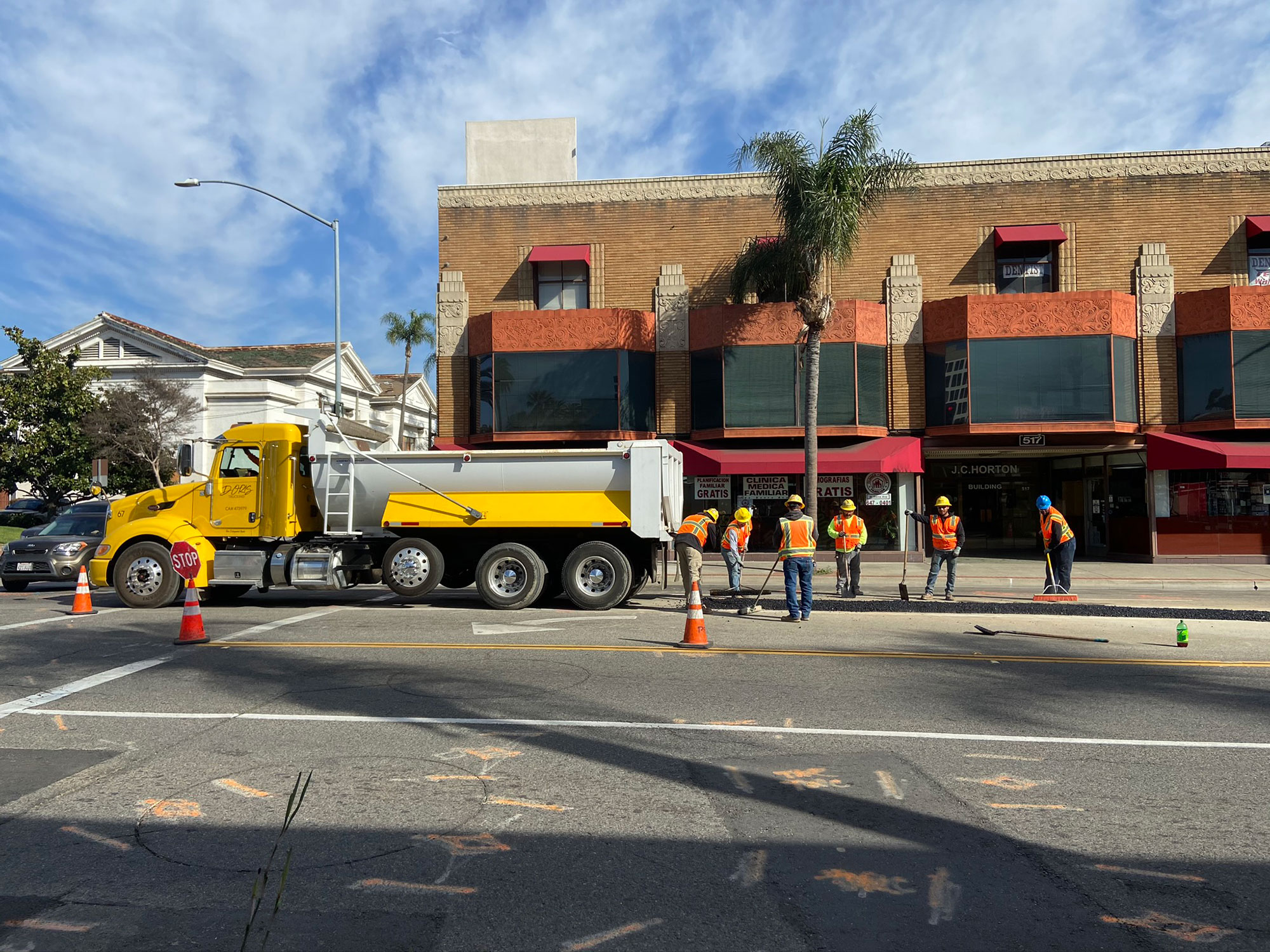 Crews laying asphalt on Main St. & Santa Ana Blvd.